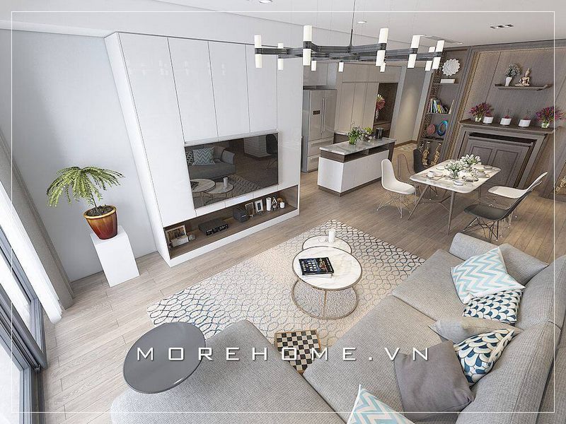 Mẫu thiết kế nội thất chung cư cao cấp với nội thất tông màu ghi trắng tinh tế tạo không gian sáng thoáng mát, trẻ trung
