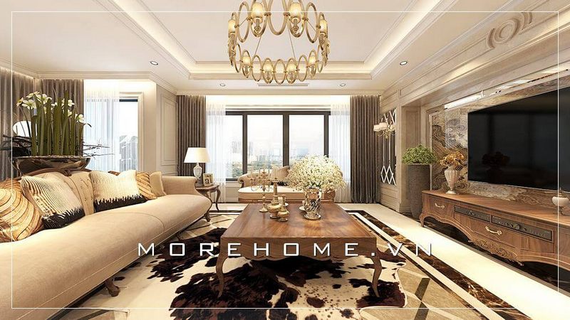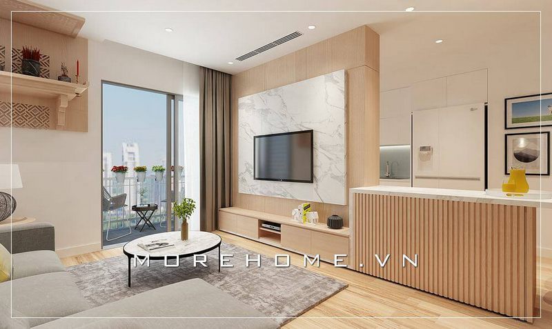 Bức tường sau tivi được ốp đá granite màu vàng màu sắc ăn nhập hoàn toàn với tông chủ đạo của nội thất phòng khách