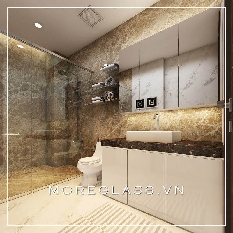 Lựa chọn đá ốp tường cao cấp màu trắng vây mây cho phòng tắm tạo nên sự thoáng mát và sạch sẽ hơn