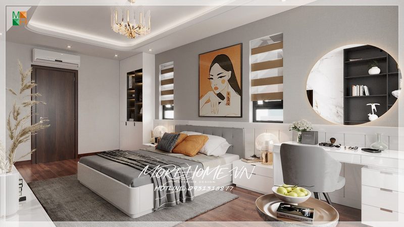 Thiết kế nội thất phòng ngủ nữ hiện đại bố trí gương soi tròn gần ban công để phản chiếu ánh sáng cho cả căn phòng
