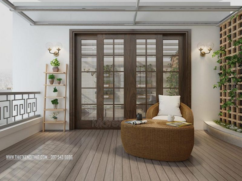 Mẫu cửa kính khung gỗ óc chó hiện đại được gia chủ lựa chọn để ngăn cách ban công với không gian sinh hoạt khác trong gia đình