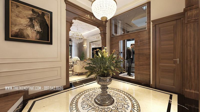 Cửa gỗ óc chó 2 cánh có phong cách tân cổ điển là lựa chọn hoàn hảo để trang trí phòng khách biệt thự cao cấp.