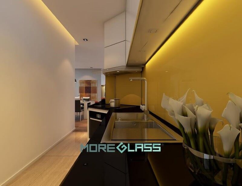 Trang trí mẫu kính ốp bếp màu vàng thư tươi tắn cho không gian nhà bếp thêm mới lạ đầy sức sống.