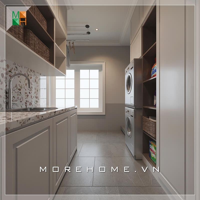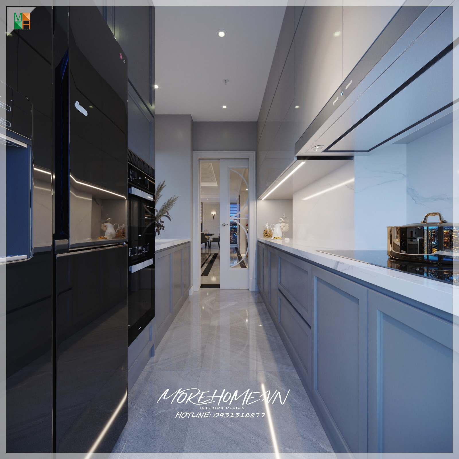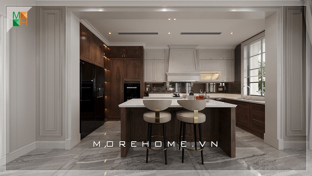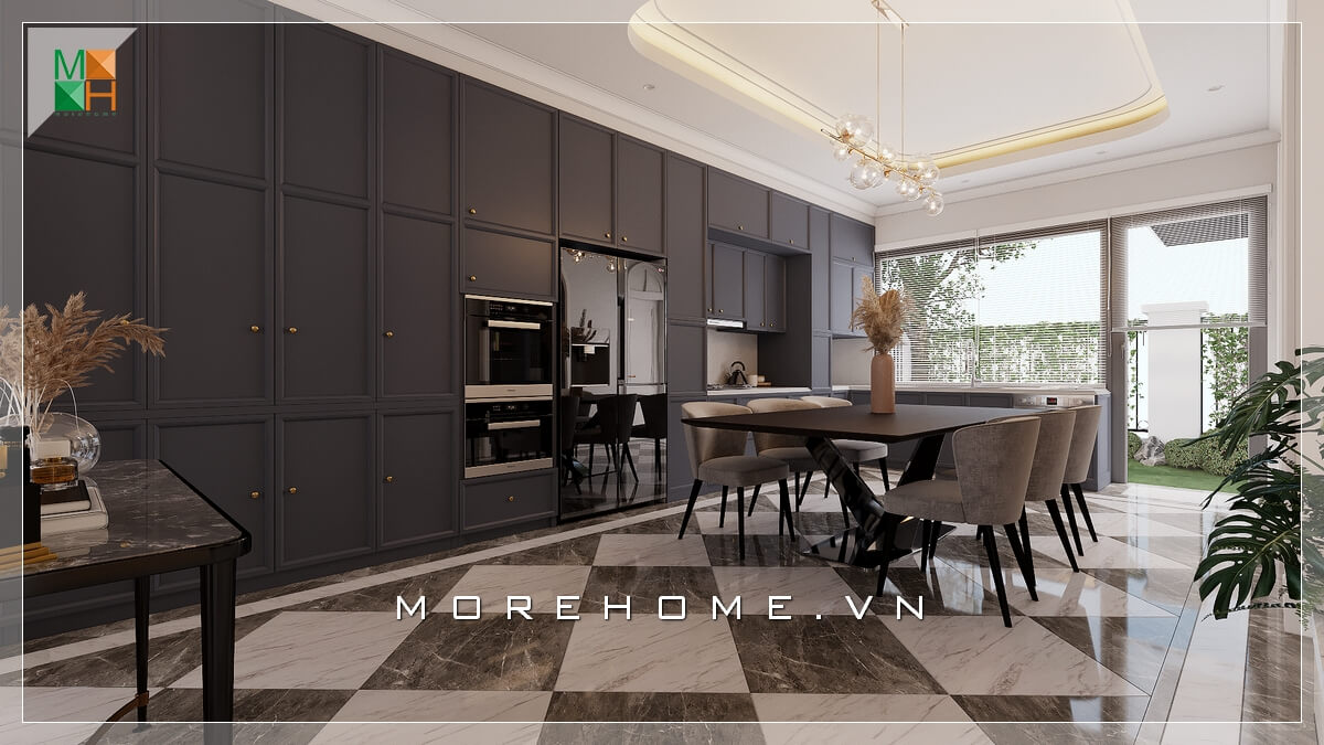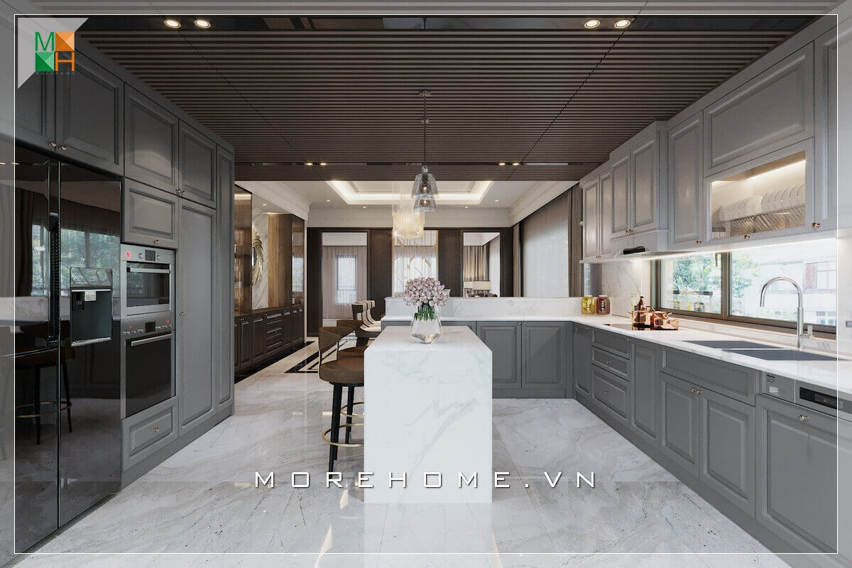 Thông thường bạn sẽ thấy khu vực bàn đảo sẽ nằm trong phòng bếp để có thể đáp ứng kịp thời nhu cầu ngay trong phòng bếp, điều này đòi hỏi phòng bếp phải khá rộng, nhưng nếu hẹp về bề ngang bạn vẫn có thể sở hữu không gian bếp đảo tuyệt đẹp như trong ý tưởng bố trí nội thất tại biệt thự Parkcity bởi Nội thất Morehome.
