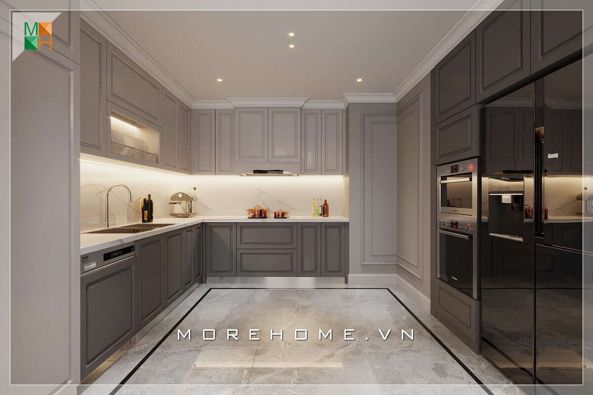 Bố trí phòng bếp với tủ bếp hình chữ U màu xám là một ý tưởng sử dụng tối đa diện tích và có thể lưu trữ những vật dụng phát sinh cần thiết trong sinh hoạt gia đình phù hợp với mọi không gian hiện đại từ chung cư, nhà phố, biệt thự.