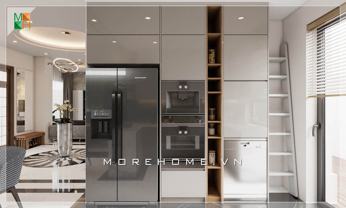 Ấn tượng với mẫu thiết kế tủ bếp đẹp có chút tân cổ điển từ những cái chạm khắc phào nổi của mặt ngoài tủ, nhưng cũng rất hiện đại sang trọng.